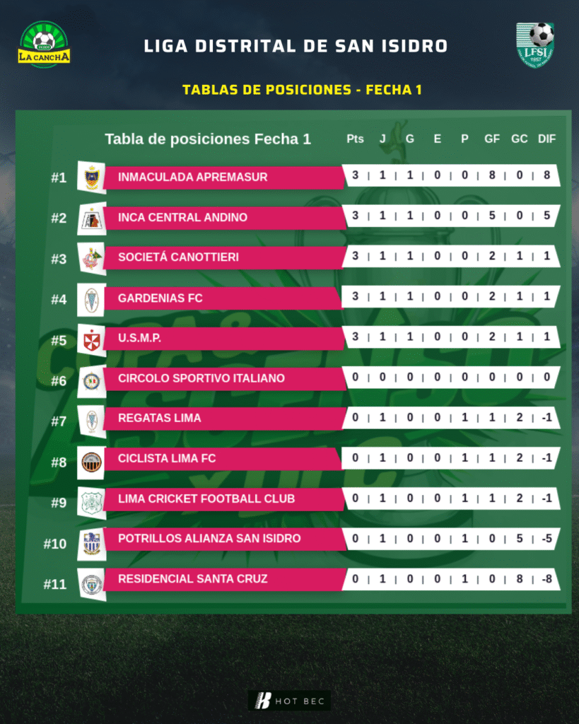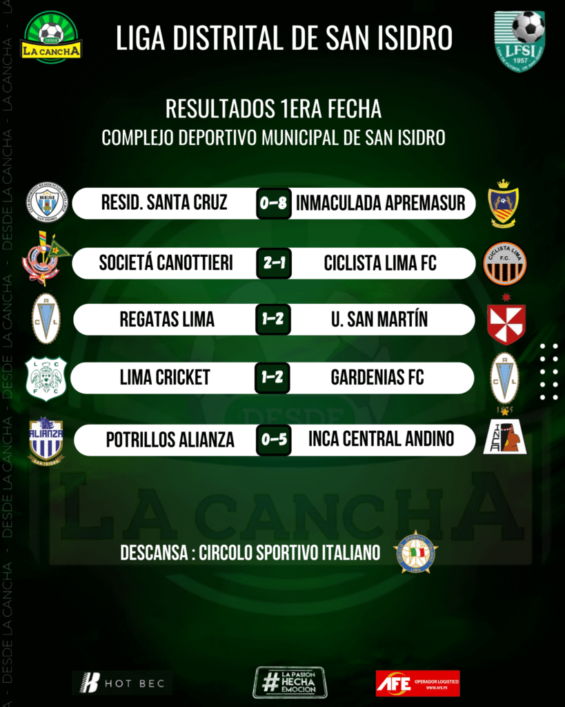 En el campo del Complejo Deportivo de San Isidro, se dio inicio a la Liga Distrital de San Isidro con cinco partidos. La Primera División de San Isidro 2026 se compone por 11 equipos. Esta semana descansó Circolo Sportivo Italiano.