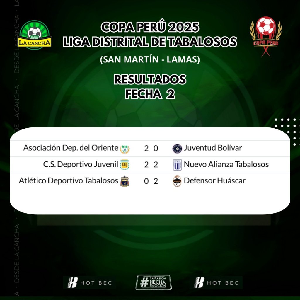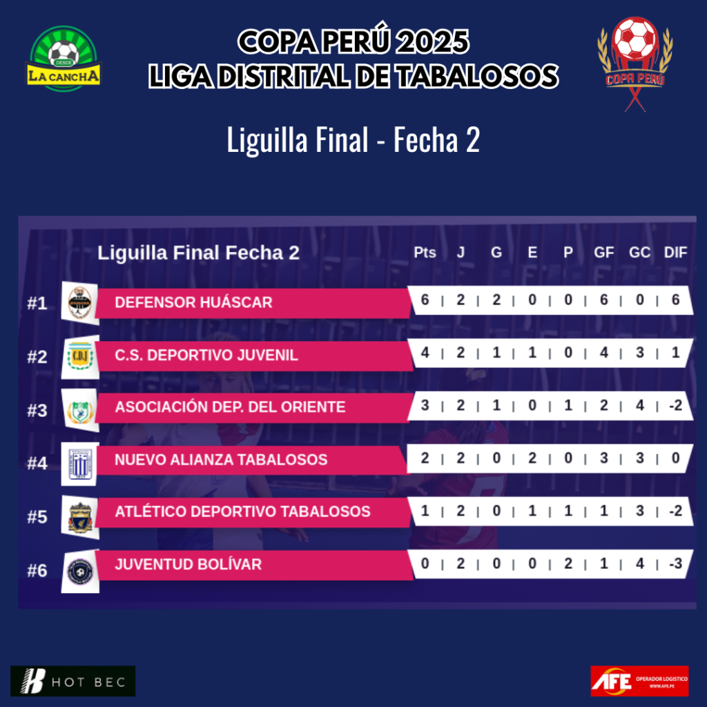 Se jugó la segunda fecha de la Liguilla Final de la Liga Distrital de Tabalosos que tiene a Defensor Huáscar como único puntero.