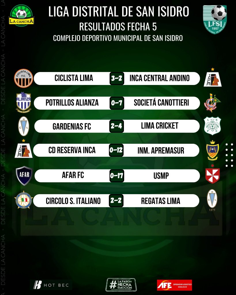 Se jugó la quinta fecha de la Liga de Fútbol de San Isidro en el Complejo Municipal del distrito con un partido excluyente , el empate entre Regatas Lima y Circolo Sportivo Italiano por 2 a 2.