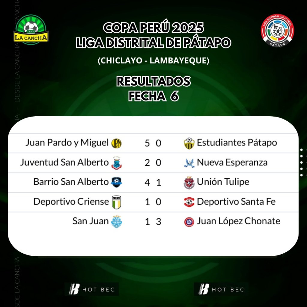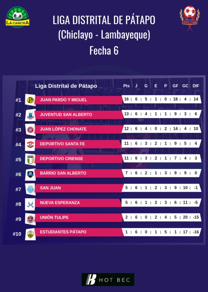 Se cumplió la sexta fecha de la Liga Distrital de Pátapo en Chiclayo y Juan Pardo no suelta el primer lugar.