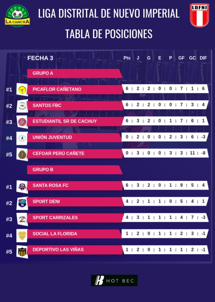 Completada la fecha 3 de la Liga Distrital de Nuevo Imperial, en el Grupo A, tres equipos se mantienen invictos y comparten el liderato: Picaflor Cañetano, Santos FBC y Estudiantil Sr. de Cachuy, todos con 6 puntos.