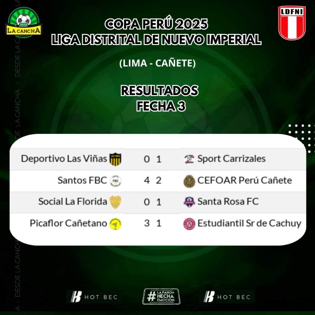 Completada la fecha 3 de la Liga Distrital de Nuevo Imperial, en el Grupo A, tres equipos se mantienen invictos y comparten el liderato: Picaflor Cañetano, Santos FBC y Estudiantil Sr. de Cachuy, todos con 6 puntos.