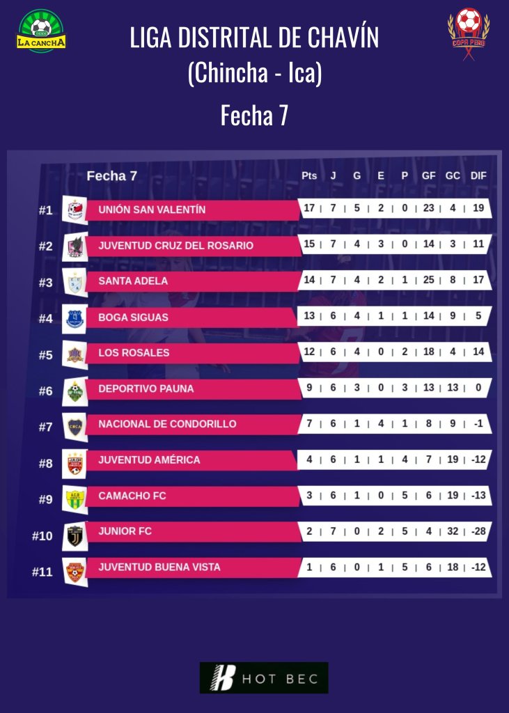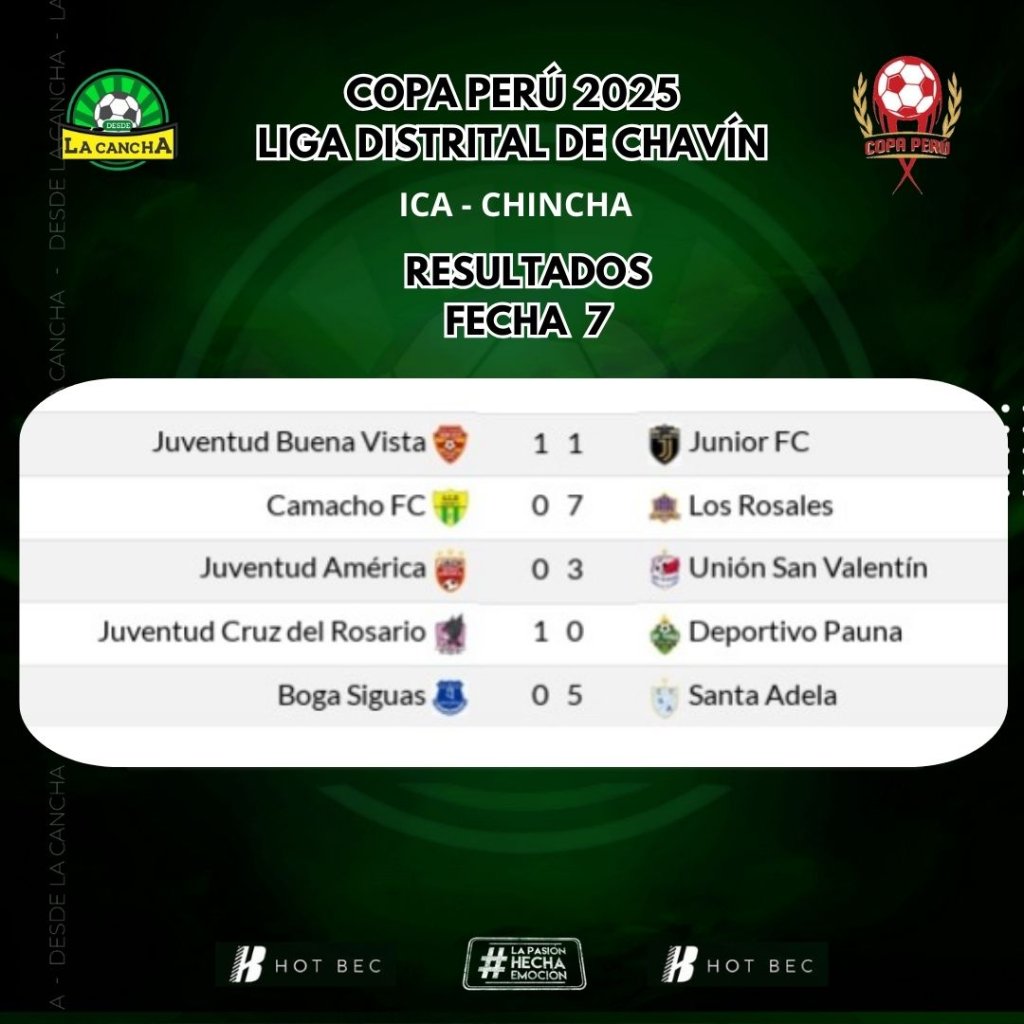 La jornada estuvo llena de goles y contundencia. Los Rosales arrasaron con un aplastante 7-0 ante Camacho FC, mientras que Unión San Valentín se impuso por 3-0 sobre Juventud América. Por su parte, Santa Adela también se sumó a la fiesta con una goleada de 5-0 frente a Boga Siguas.
