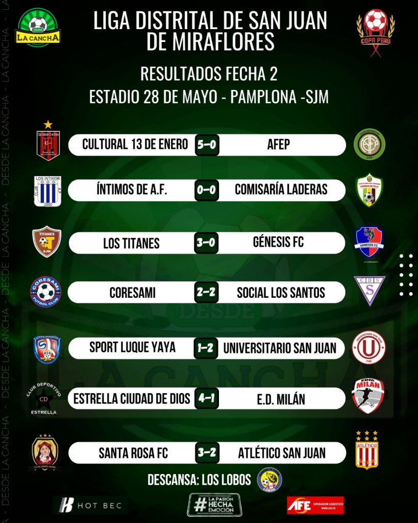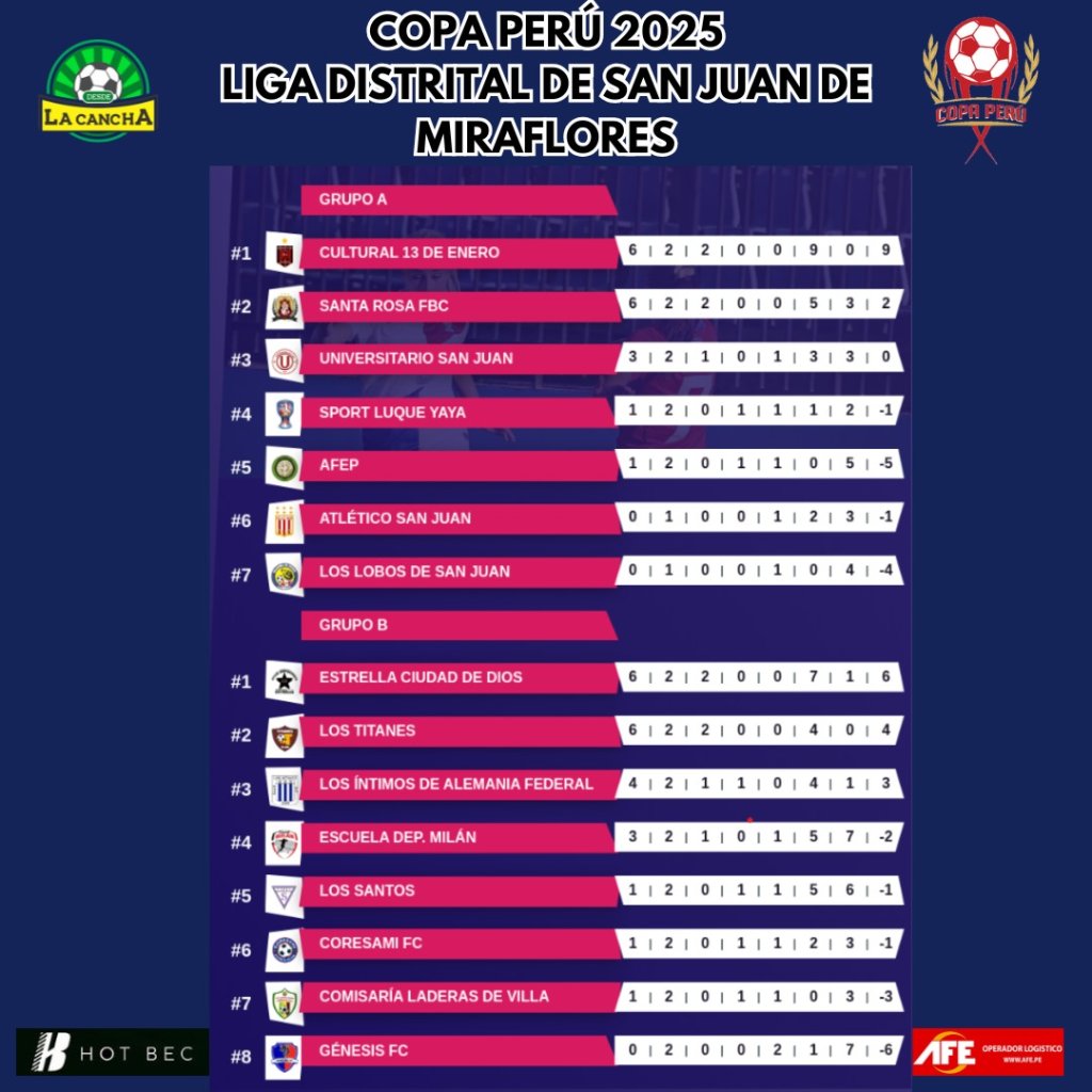En el estadio 28 de Mayo se desarrolló la segunda fecha de la Liga Distrital de San Juan De Miraflores con dos punteros por grupo. En la serie A, Cultural 13 de Enero y Santa Rosa van punteros con seis puntos. De igual forma, en el grupo B, Estrella Ciudad de Dios y los Titanes marchan firmes en la cima.